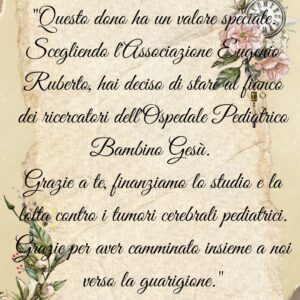 Come bomboniera, con all’interno un velo di tulle con i confetti e il bigliettino dell’evento. Ogni sacchetto sarà inoltre accompagnato dalla pergamena dell’Associazione per ringraziare chi lo ha scelto e chi lo riceve per la partecipazione alla raccolta fondi per la ricerca.